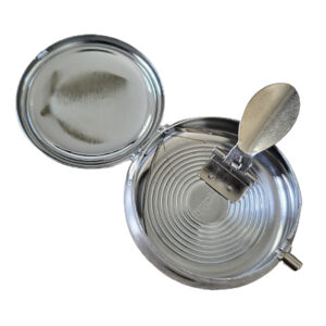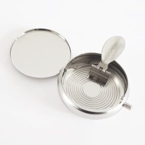 Leuk zilverkleurig zakasbakje met een groen raster aan de bovenkant. Als je het open maakt kun je je sigaret op de houder leggen. Het formaat van dit kleine asbakje is ongeveer 60x40x20 mm. Gewicht 0,058 kg