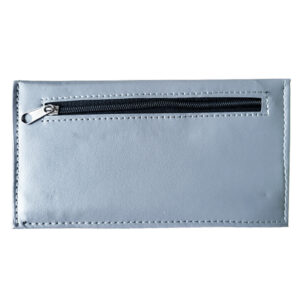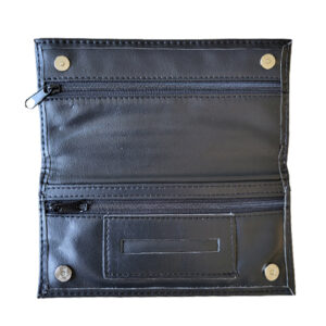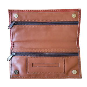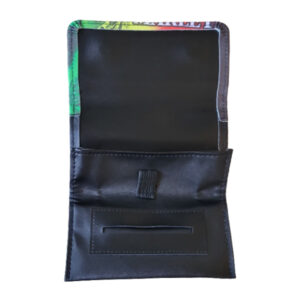 Aan de binnenzijde zitten 2 vakjes met ritsen waar je bijvoorbeeld je aansteker in op kunt bergen en er zit een apart vakje voor je vloeitjes.