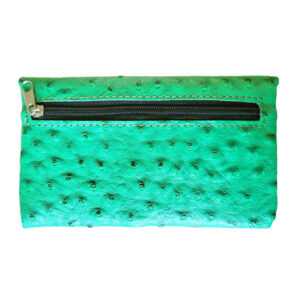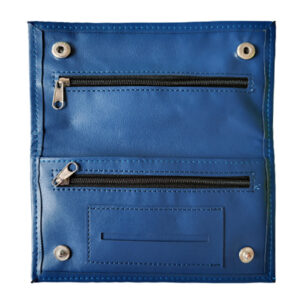 Aan de achterkant zit een vakje met een ritsje en aan de binnenkant zitten ook nog 2 vakjes met ritsjes en een apart vakje voor je vloeitjes.