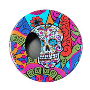 Handig zakasbakje met La Catrina skull. Het asbakje sluit met een draaidekseltje. Het dekseltje kun je er ook helemaal afdraaien zodat je het asbakje schoon kunt maken. Door het kleine formaat zijn ze makkelijk om mee te nemen.